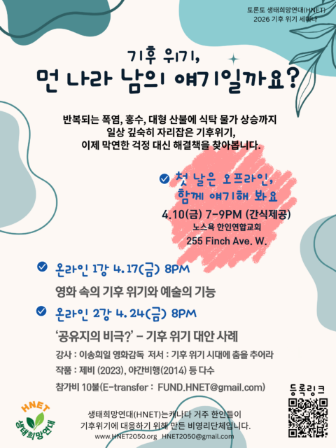 - 토론토 생태희망연대(HNET2050.org)는 ‘기후위기, 먼 나라 남의 얘기일까요’ 이라는 주제로 온/오프라인 세미나를 4월10일(금) 부터 3주에 걸쳐 개최합니다.